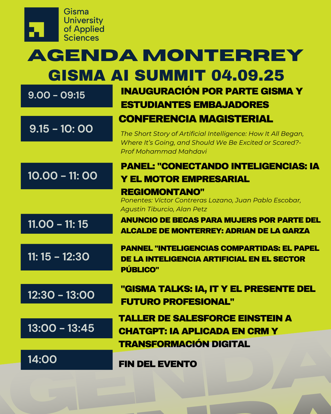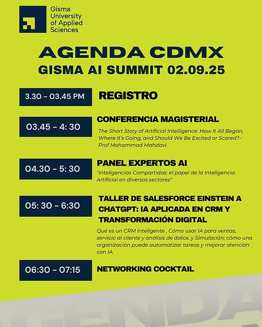 Acompáñanos a descubrir su impacto desde una perspectiva académica, tecnológica, empresarial y social en este evento dirigido a agentes y partners educativos de GISMA en México y estudiantes interesados en inteligencia artificial, ciencia de datos y estudios en Alemania